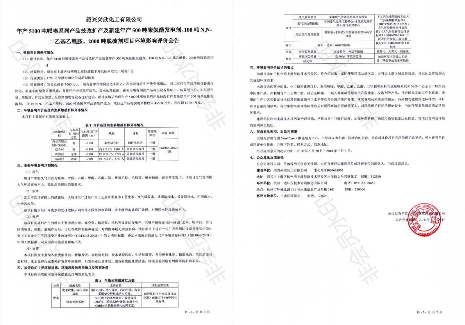 Shaoxing Xingxin Chemical Technology transformation expansion and new project environmental impact assessment announcement
